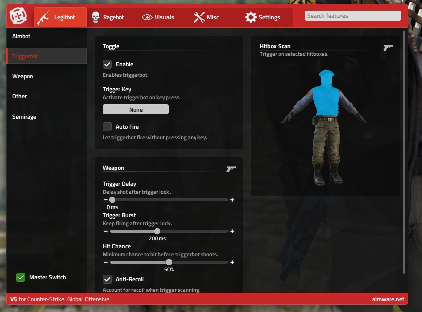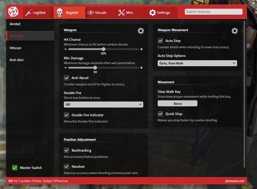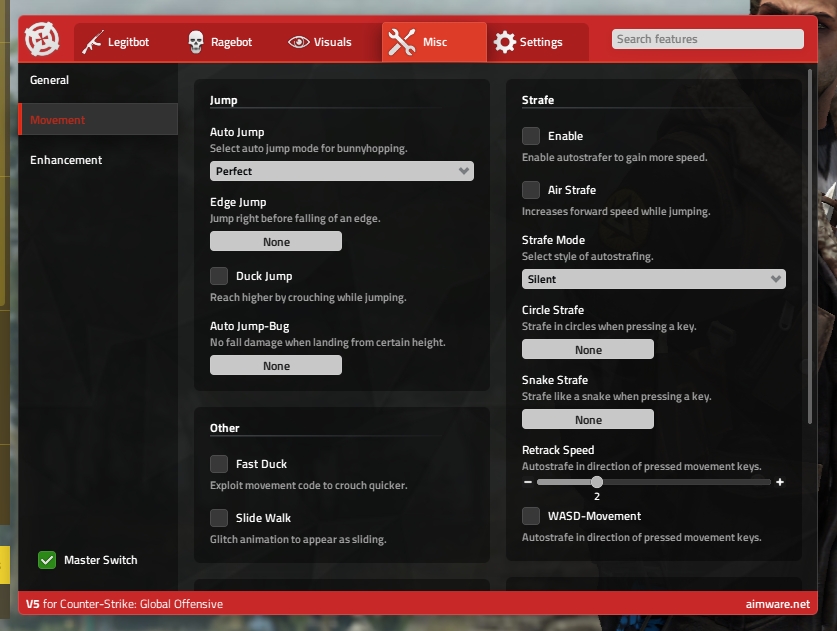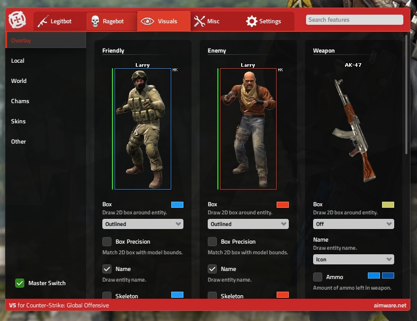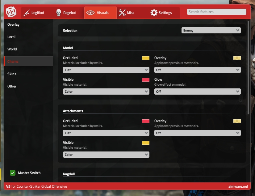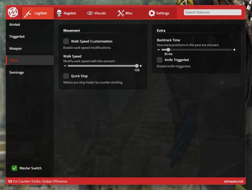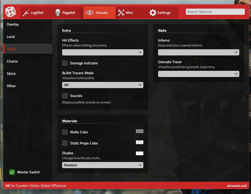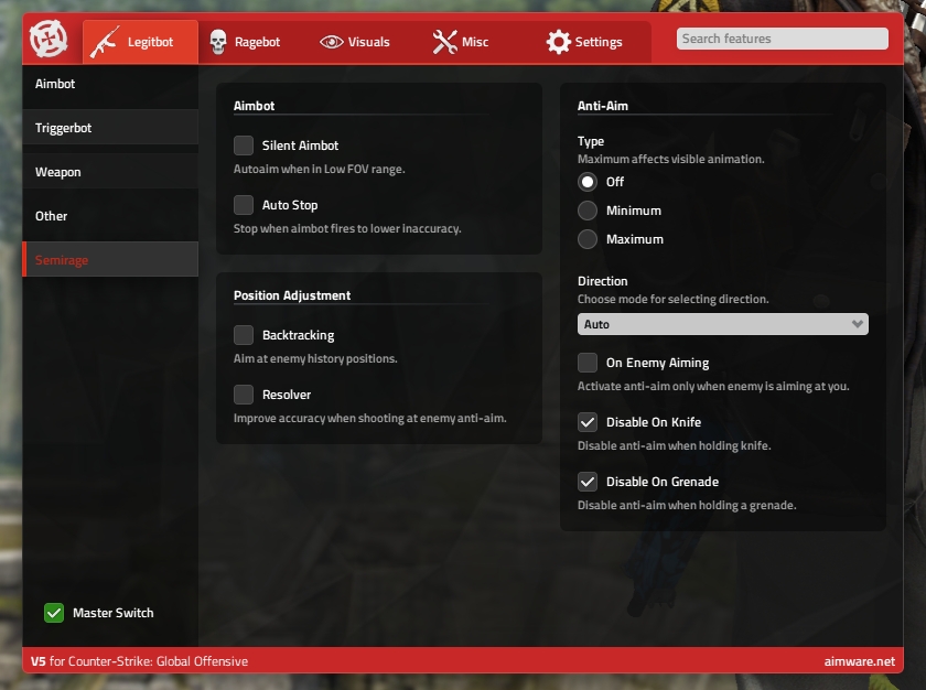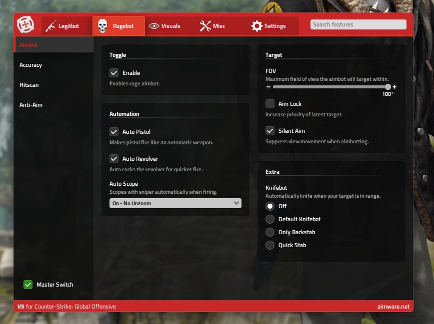 On the left side are the sections inside the tab pages. And on the bottom in both legitbot and ragebot you will find "Master switch". Keep in mind that only one feature set could be enabled at the same time for both legit and ragebot.
