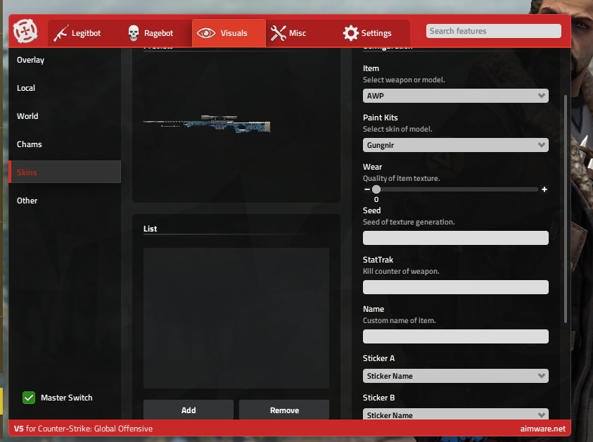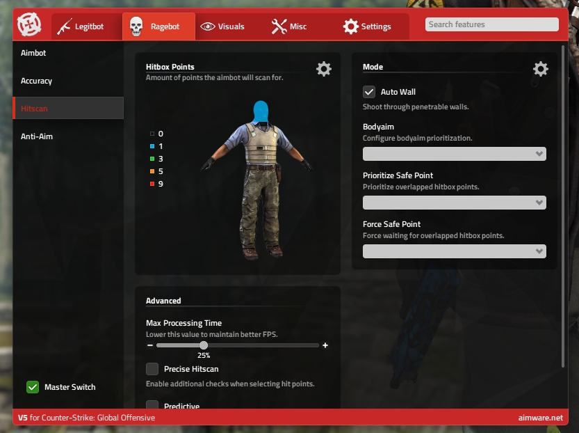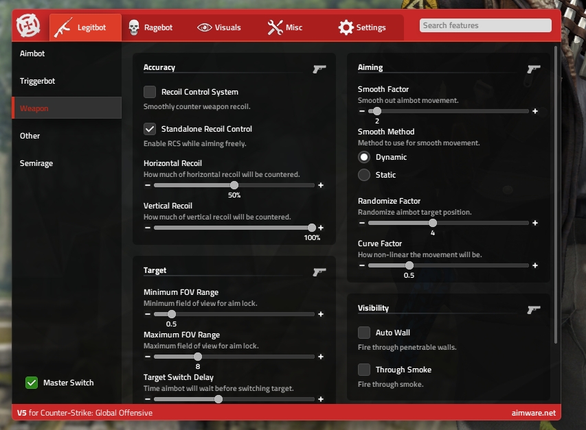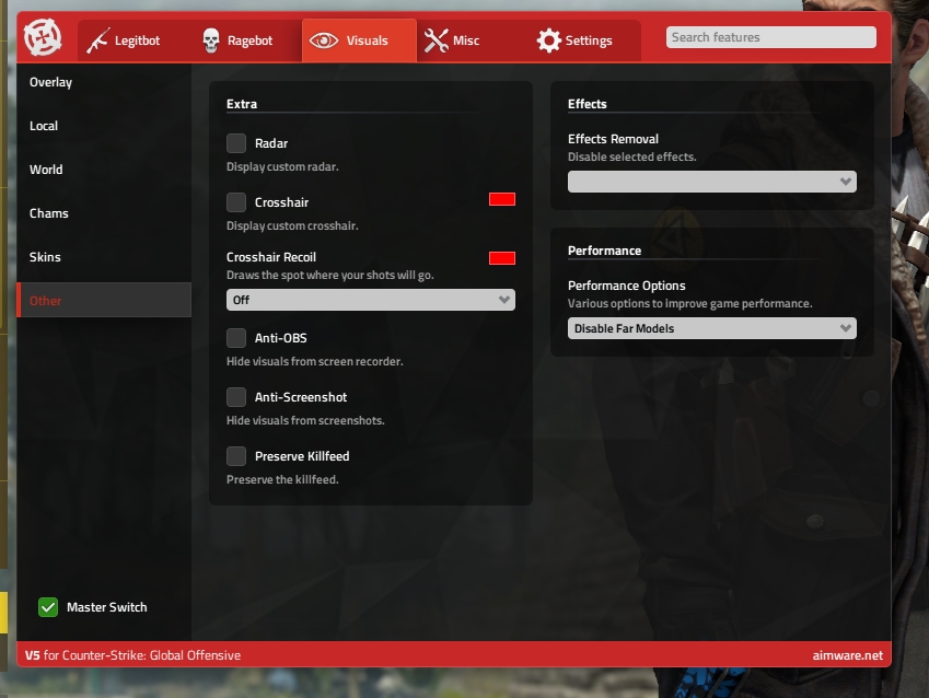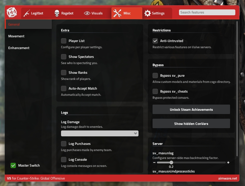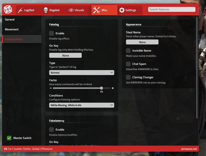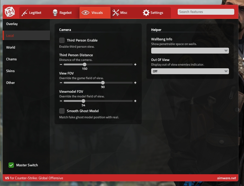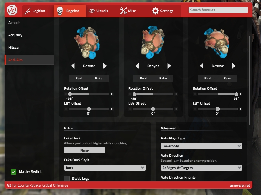 On the left side are the sections inside the tab pages. And on the bottom in both legitbot and ragebot you will find "Master switch". Keep in mind that only one feature set could be enabled at the same time for both legit and ragebot.