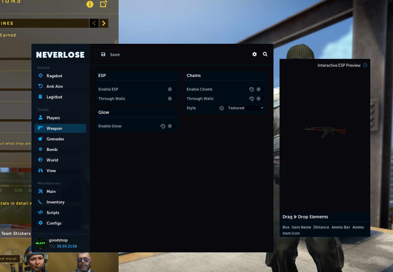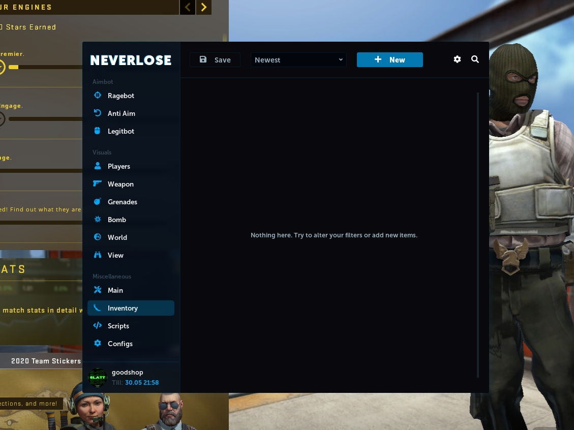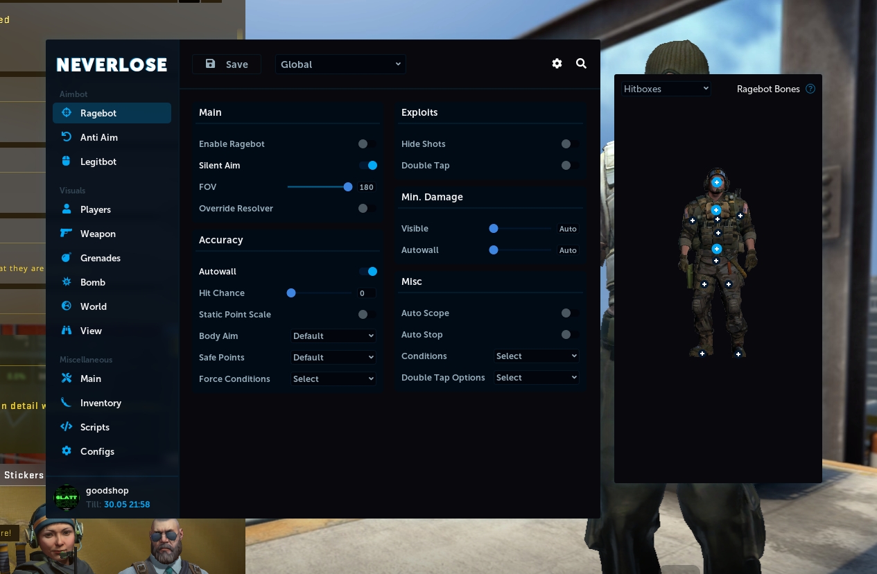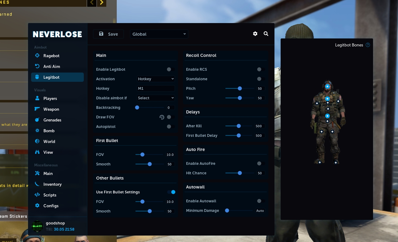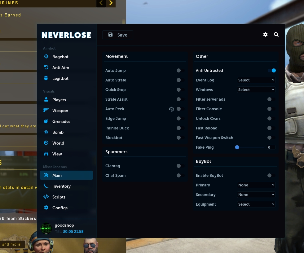 If you used spirthack before, you will find both cheat's layout are similar. As you seen from the menu, the left panel is neverlose's navigation panel which allows you to navigate through different tabs of the cheat. On the bottom right, you can see your username and your subscription due date.