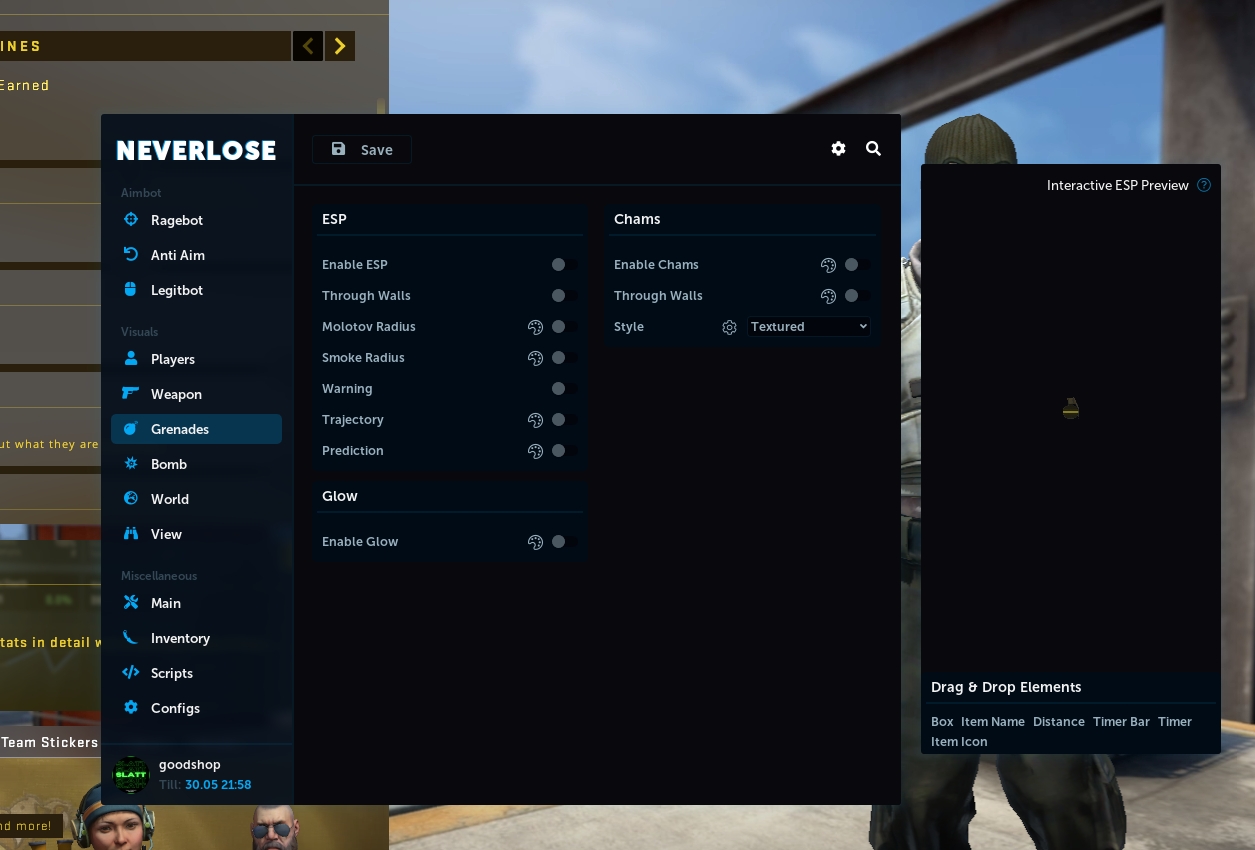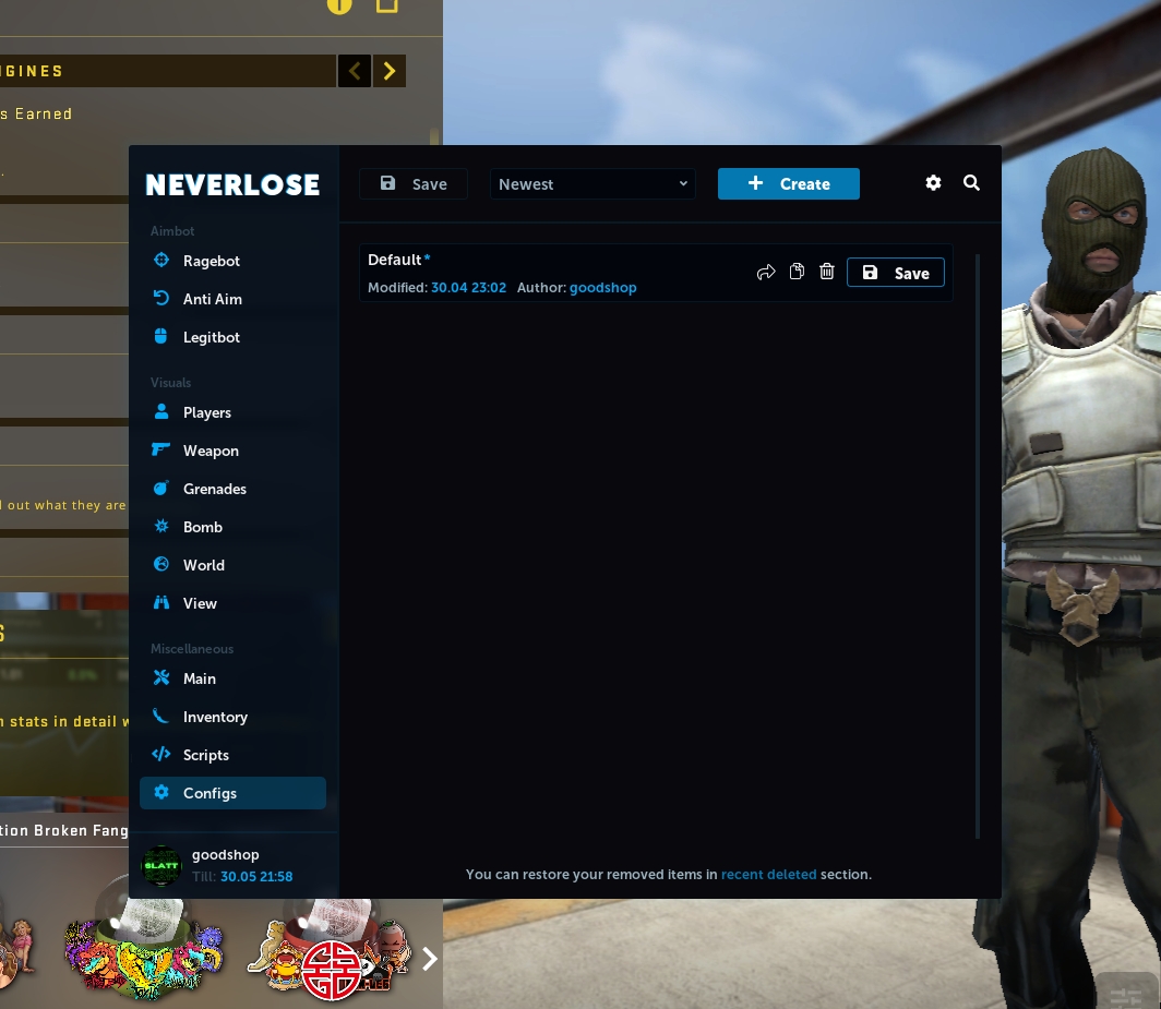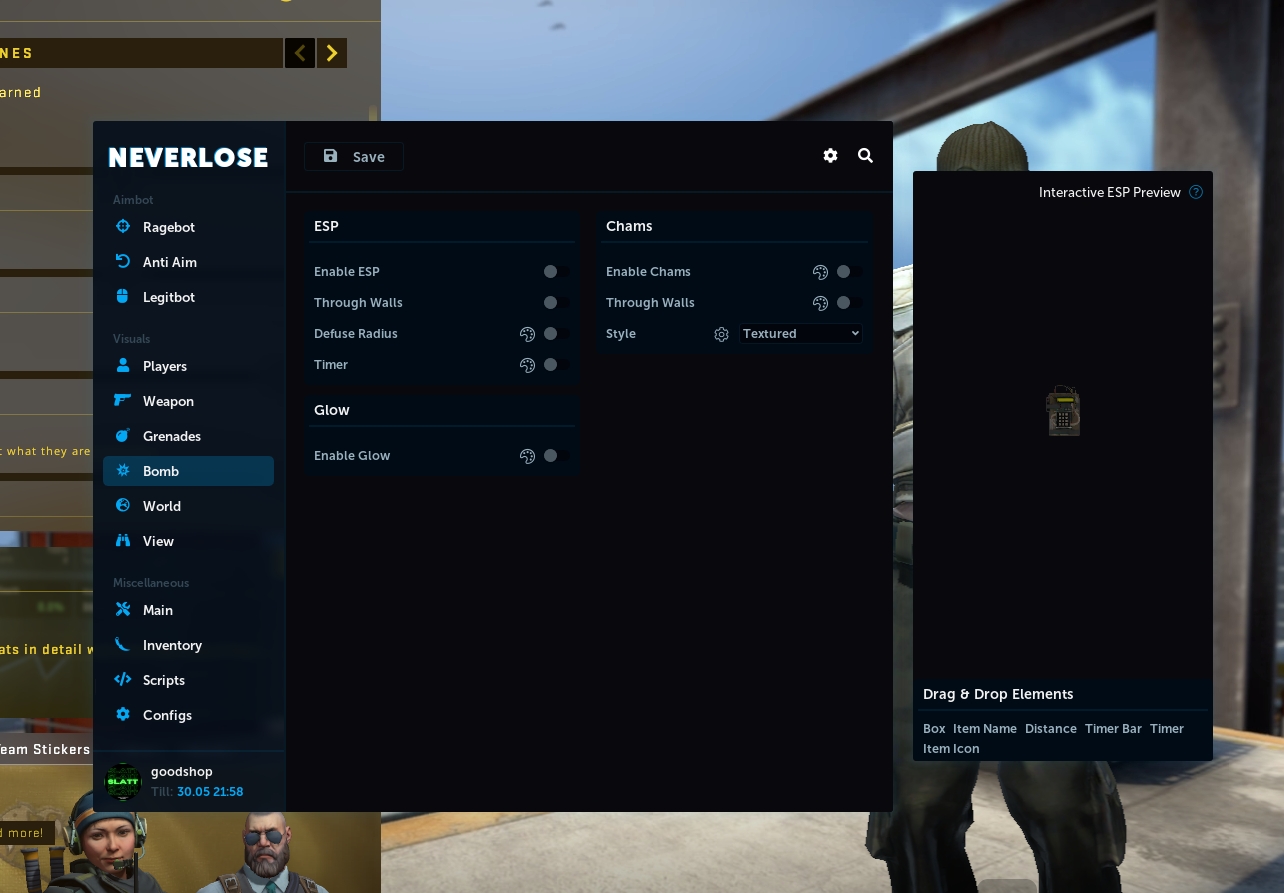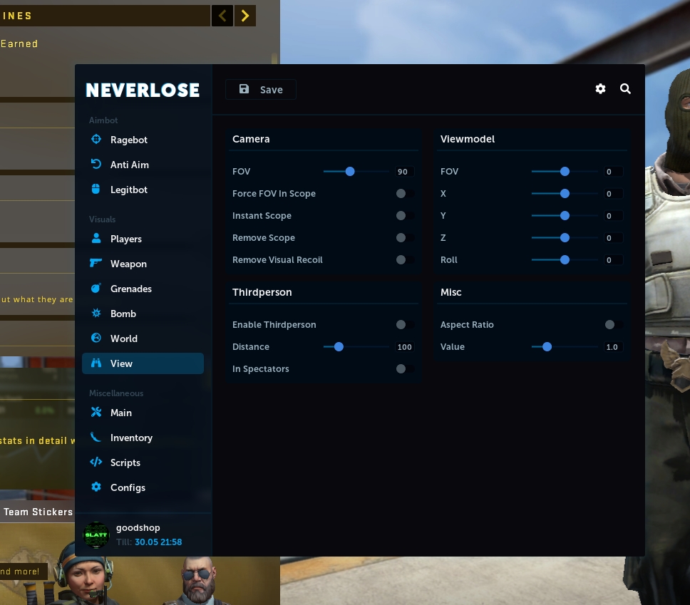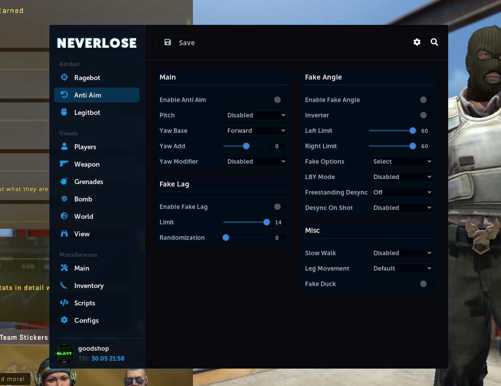 If you used spirthack before, you will find both cheat's layout are similar. As you seen from the menu, the left panel is neverlose's navigation panel which allows you to navigate through different tabs of the cheat. On the bottom right, you can see your username and your subscription due date.