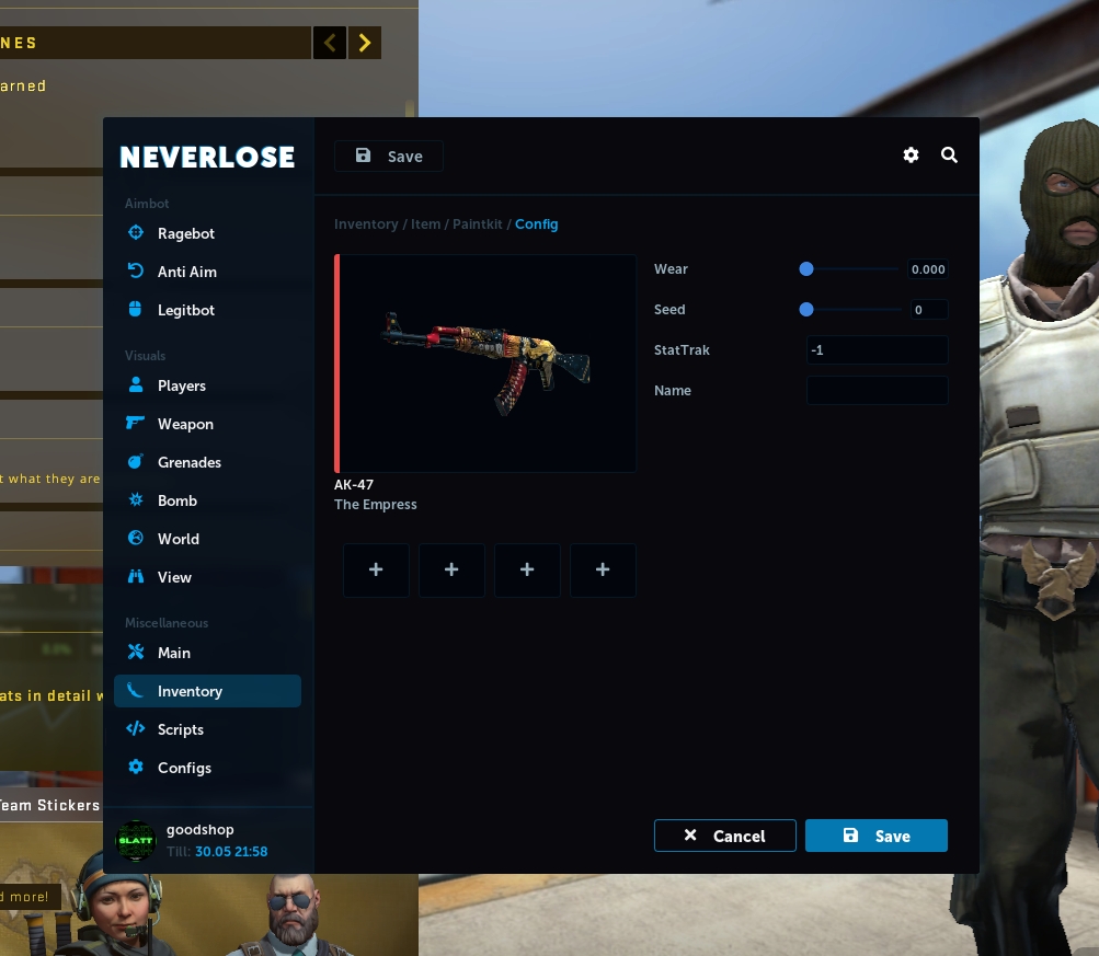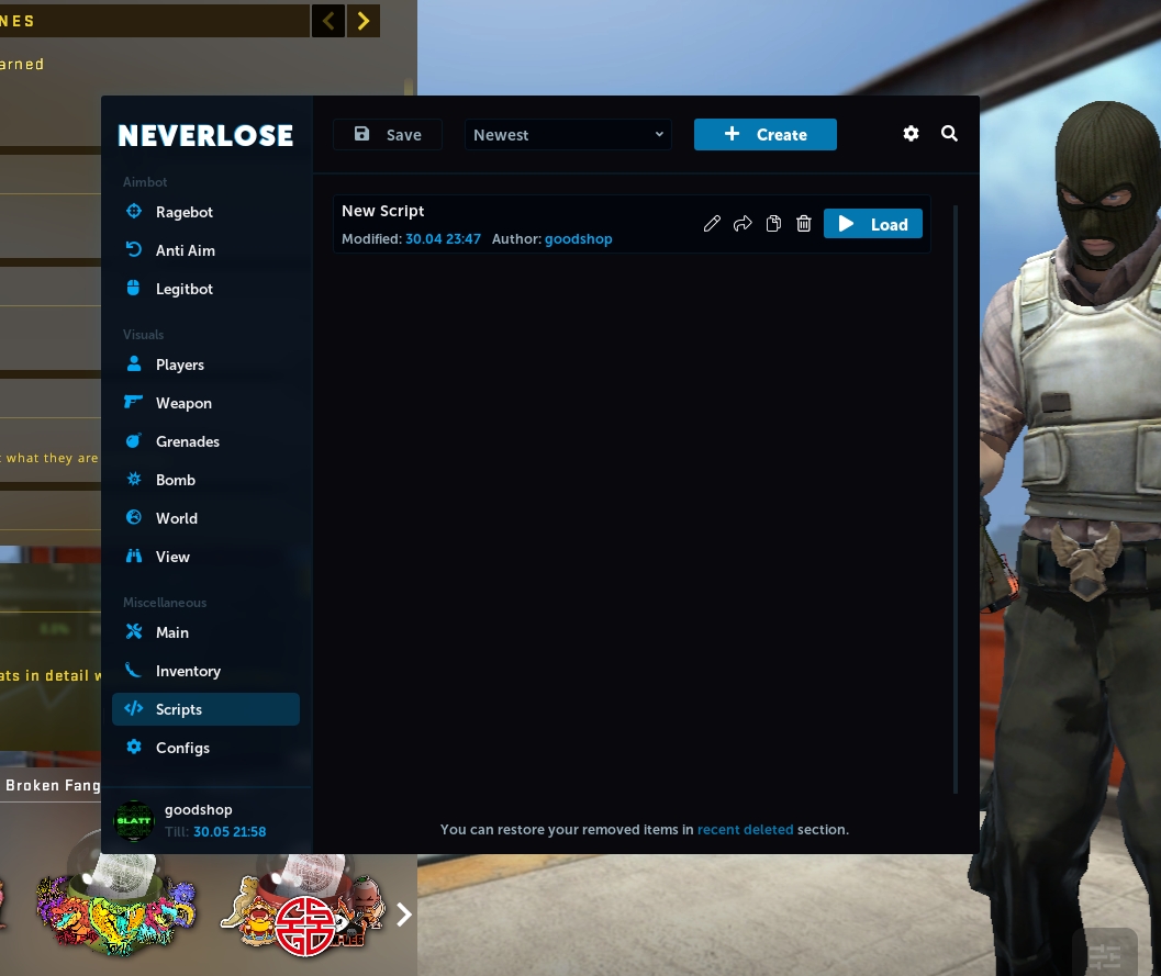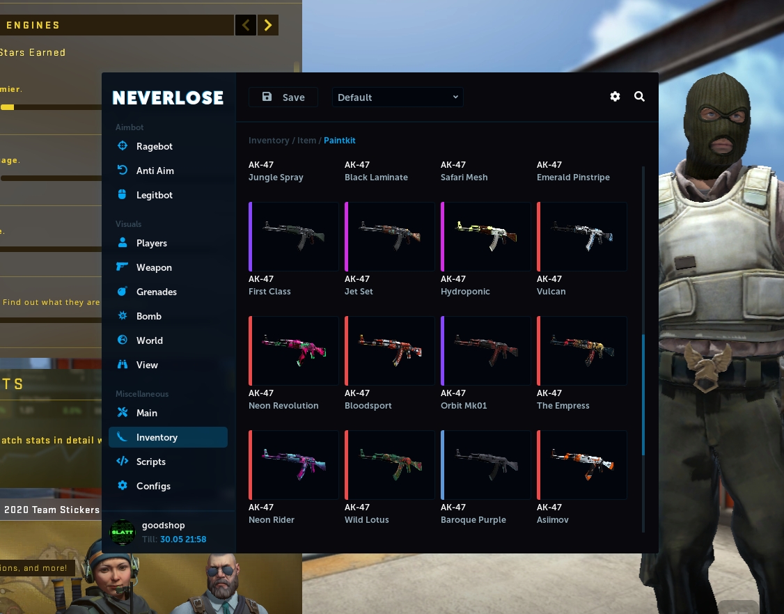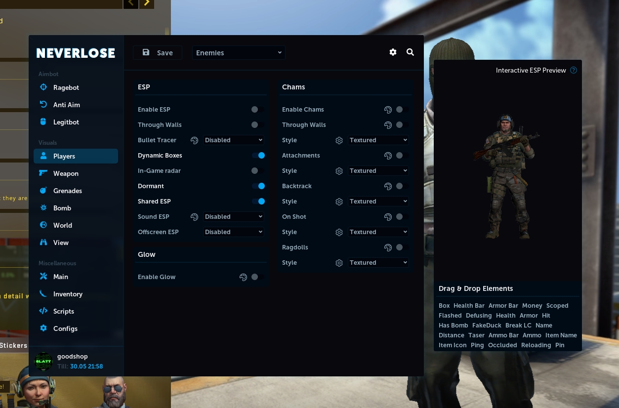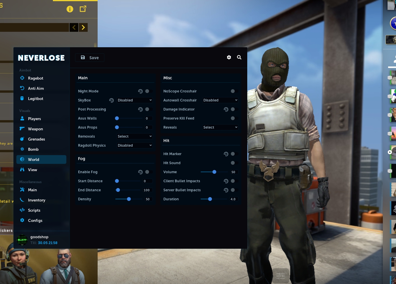 If you used spirthack before, you will find both cheat's layout are similar. As you seen from the menu, the left panel is neverlose's navigation panel which allows you to navigate through different tabs of the cheat. On the bottom right, you can see your username and your subscription due date.